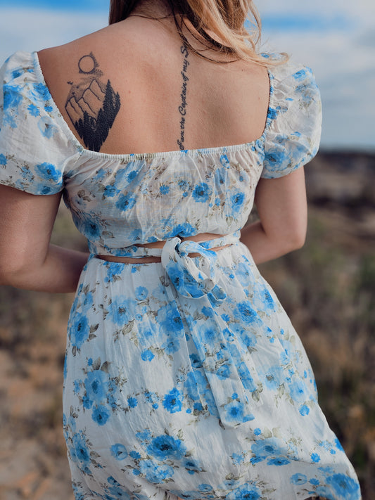 Floral Puff Sleeve Square Neck Knot Open Back Mini Dress
